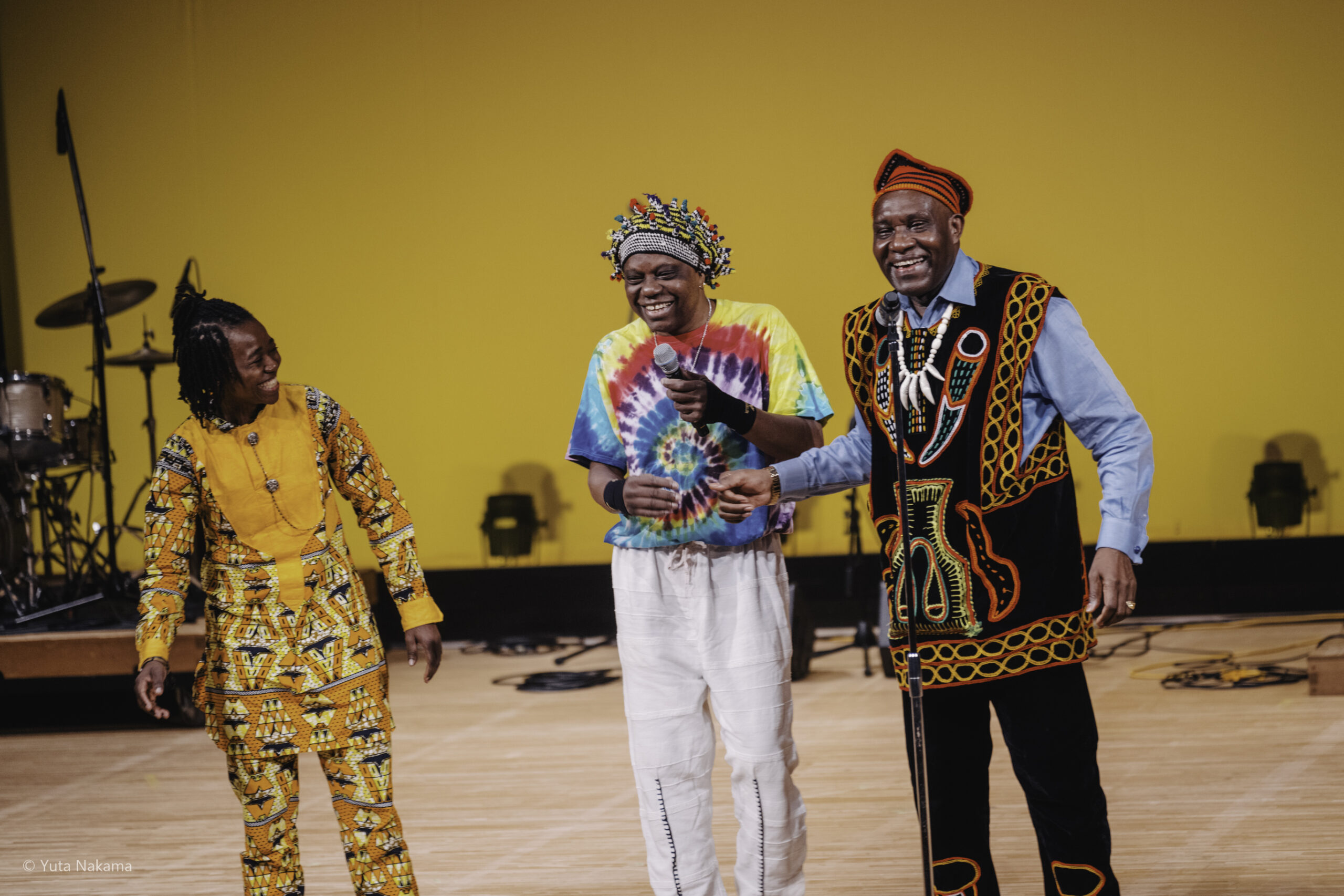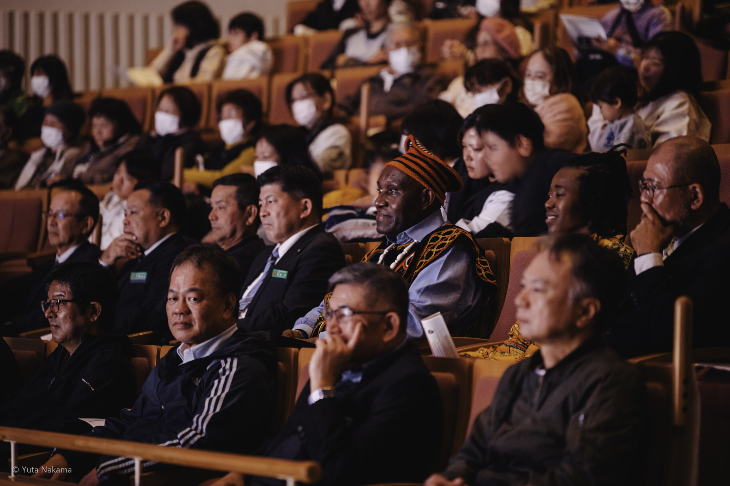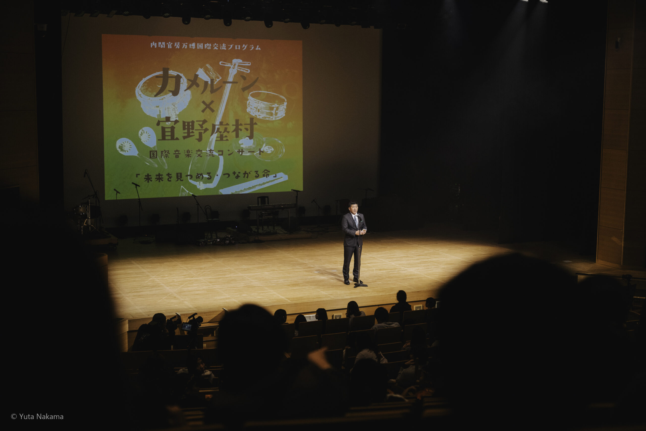 宜野座村は、2025年日本国際博覧会(関西・大阪万博)の国際交流プログラムとして、カメルーンのバカ族と文化交流を予定しており、本交流コンサートは、その「プレ交流」として、ゼンゲ駐日カメルーン大使とワッシー音楽大使をお招きして行いました。