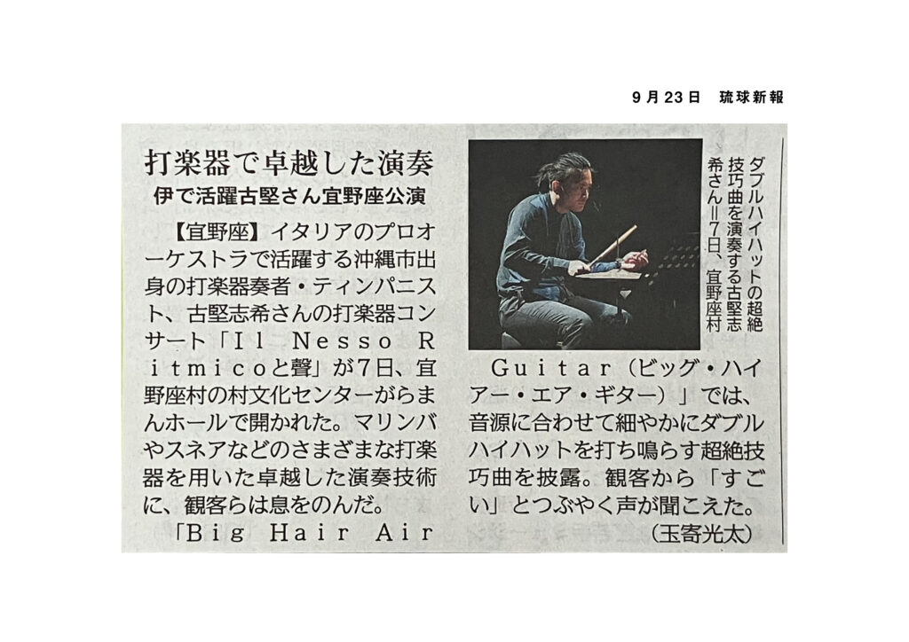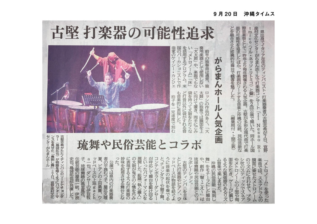先日の古堅志希打楽器コンサート の様子が沖縄タイムス・琉球新報に掲載されました。