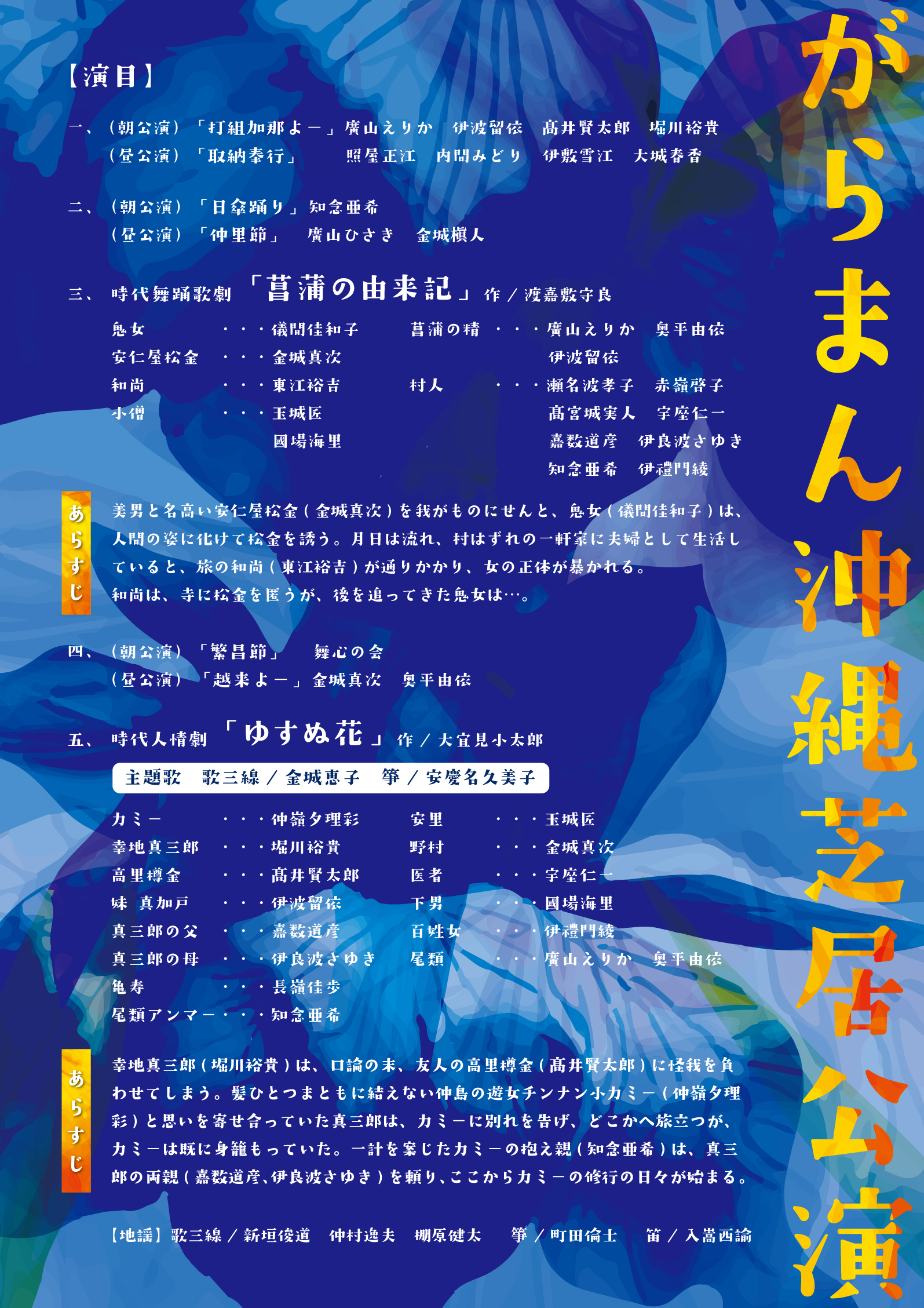瀬名波孝子、赤嶺啓子、髙宮城実人、伊良波さゆき、金城真次、東江裕吉、宇座仁一