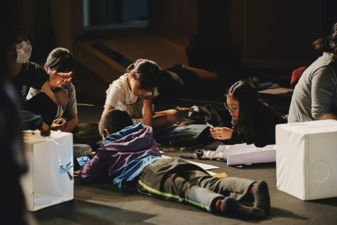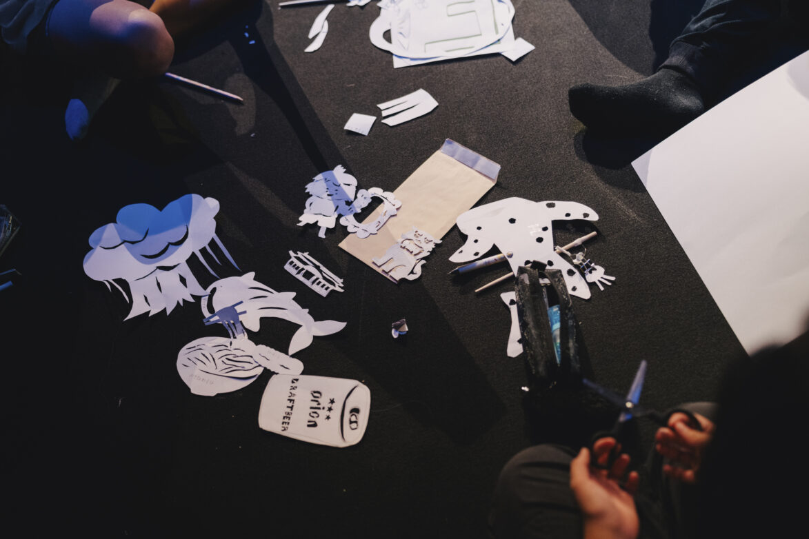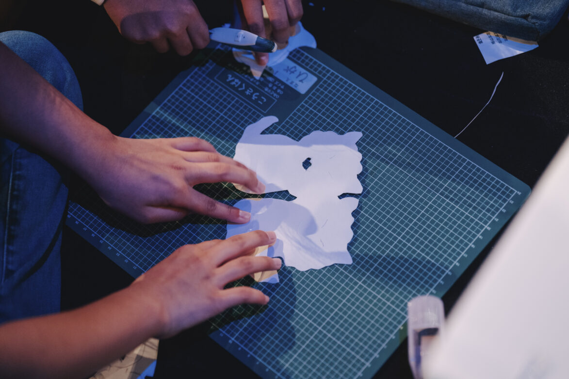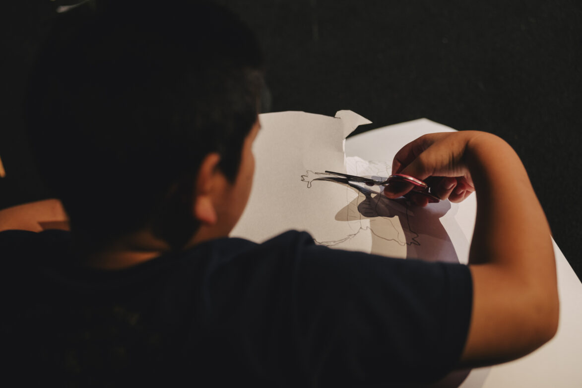 光にかざすたびに影が浮かび上がり、自分のつくった形が「物語の一部」になっていく感覚を、子どもたちは楽しんでいました。