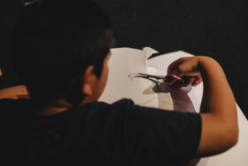 子どもたちは、Day3で出し合った言葉やイメージを手がかりに、ハサミを使って思い思いの形を切り出していきます。