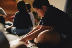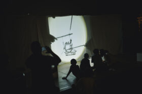 ワークショップ最終日のこの日は、前回の宿題として考えてきたアイデアをもとに、いよいよ”影絵づくり”に取り組みました。