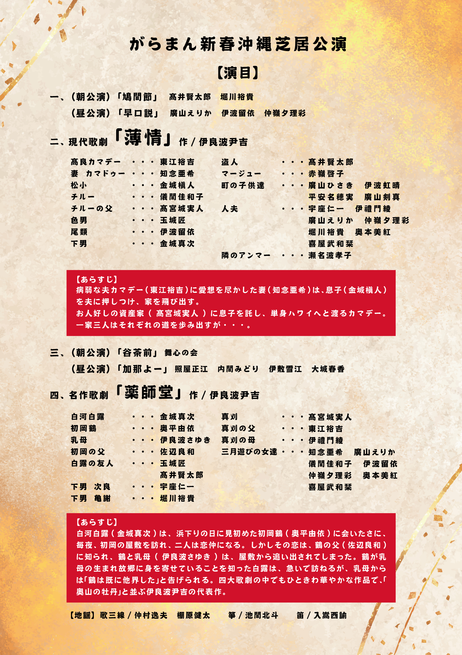 【出演】瀬名波孝子、赤嶺啓子、髙宮城実人、東江裕吉、宇座仁一、佐辺良和、伊良波さゆき、知念亜希、金城真次、伊禮門綾、廣山えりか、玉城匠、儀間佳和子、奥平由依、伊波留依、仲嶺夕理彩、髙井賢太郎、堀川裕貴、奥本美紅、喜屋武和栞、廣山ひさき、金城槇人、廣山翔真、廣山剣真